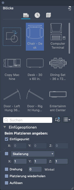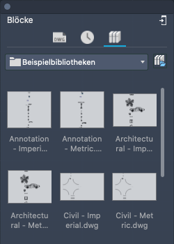 Ermöglicht Ihnen das Zugreifen auf und Einfügen von Blöcken aus der aktuellen Zeichnung, aus zuletzt verwendeten Blöcken oder aus Blockbibliotheken.