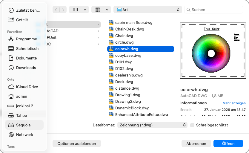 Zeigt das aktuelle Verzeichnis bzw. Laufwerk an. Klicken Sie auf den Dropdown-Pfeil, um die Verzeichnishierarchie des Ordnerpfads anzuzeigen und zu einem vorherigen Ordner, Laufwerk oder Speicherort zu navigieren. Mit der Systemvariablen REMEMBERFOLDERS können Sie steuern, ob die zuletzt verwendeten Pfade aller Sitzungen in jedem Standarddialogfeld zur Dateiauswahl gespeichert werden.