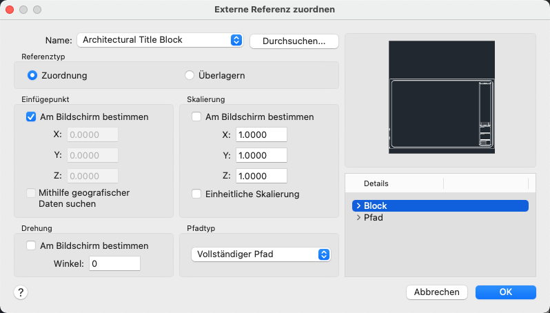 Zeigt Informationen über den Block un den Dateipfad der zugeordneten externen Referenzen an.