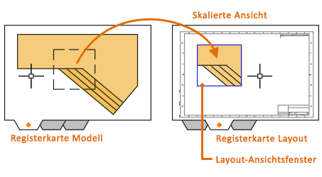 Layout-Ansichtsfenster sind Objekte, die Ansichten des Modellbereichs anzeigen. Diese werden in einem Layout im Papierbereich erstellt, skaliert und platziert.