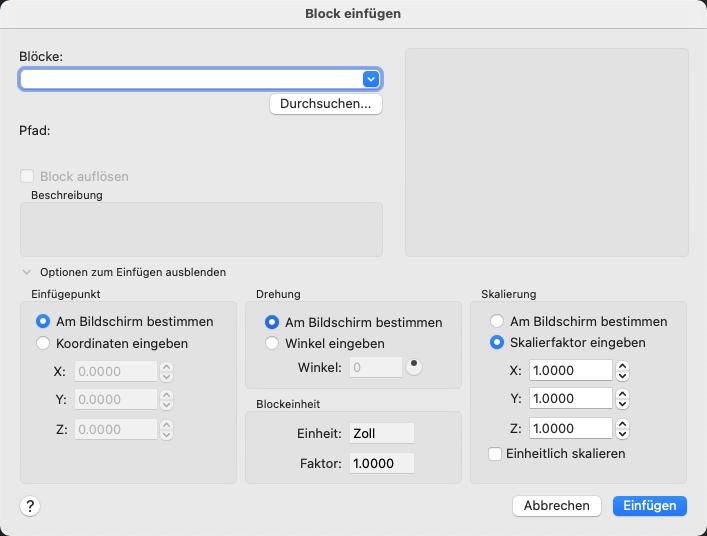 Erweitert oder reduziert den Abschnitt Optionen zum Einfügen, in dem Sie den Einfügepunkt, die Drehung und die Skalierung für die zu erstellende Blockreferenz angeben können.