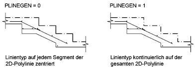 Bei Polylinien können Sie festlegen, ob ein Linientypmuster auf den einzelnen Segmenten zentriert oder über die Scheitelpunkte der gesamten Länge einer Polylinie ausgezogen wird. Die Festlegung erfolgt mithilfe der Systemvariablen PLINEGEN.