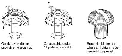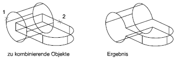 Zusammengesetzte Volumenkörper werden mithilfe der folgenden Befehle aus zwei oder mehr Volumenkörpern, Flächen oder Regionen erstellt: VEREINIG, DIFFERENZ und SCHNITTMENGE.