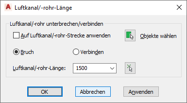 Manuelle Auswahl von zu ändernden Luftkanal/-rohr-Segmenten Klicken Sie auf (Objekte auswählen) und wählen Sie die Segmente aus, die Sie unterbrechen bzw. verbinden möchten.