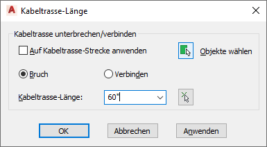| Anwenden der Länge auf die gesamte Strecke | Wählen Sie Auf Kabeltrassenstrecke anwenden bzw. Auf Installationsrohrstrecke anwenden. |