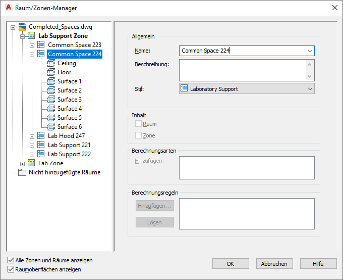Sie können den Raum/Zonen-Manager verwenden, um die Zonenhierarchie und Rauminformationen wie den Oberflächen- und Öffnungstyp zu überprüfen.
