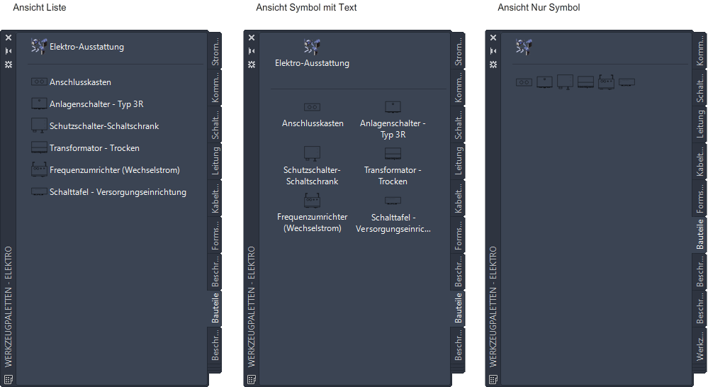 Die gleiche Werkzeugpalette in drei unterschiedlichen Ansichten