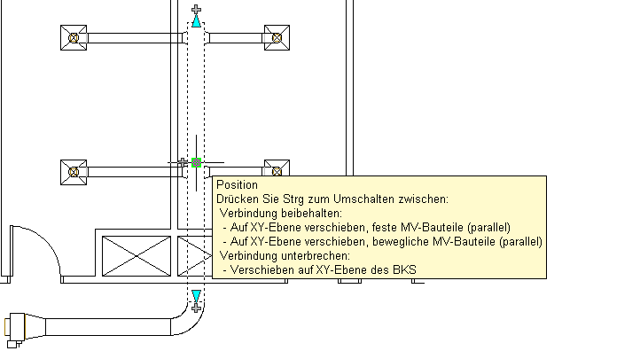 Mit Positionsgriffen können Sie Luftkanal/-rohr-Segmente, Luftkanal/-rohr-Formstücke und Lüftungs-MV-Bauteile wie im Folgenden gezeigt verschieben.