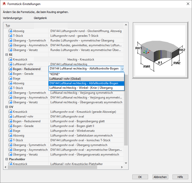 Luftkanal/-rohr - Bauteil-Routing-Voreinstellungen.
