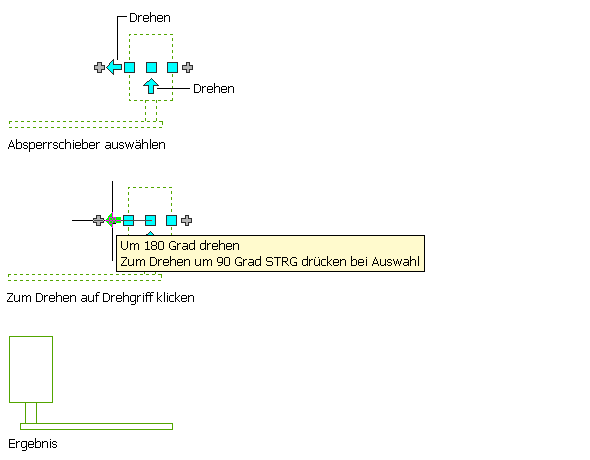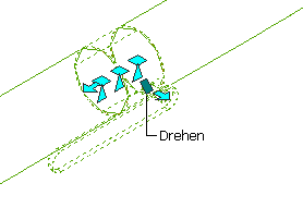 Wenn ein Bauteil, ein Formstück oder ein Abzweig in isometrischen Ansichten Bogenverbinder an entgegengesetzten Enden haben, können Sie auch mit dem rautenförmigen Griff zum Drehen (