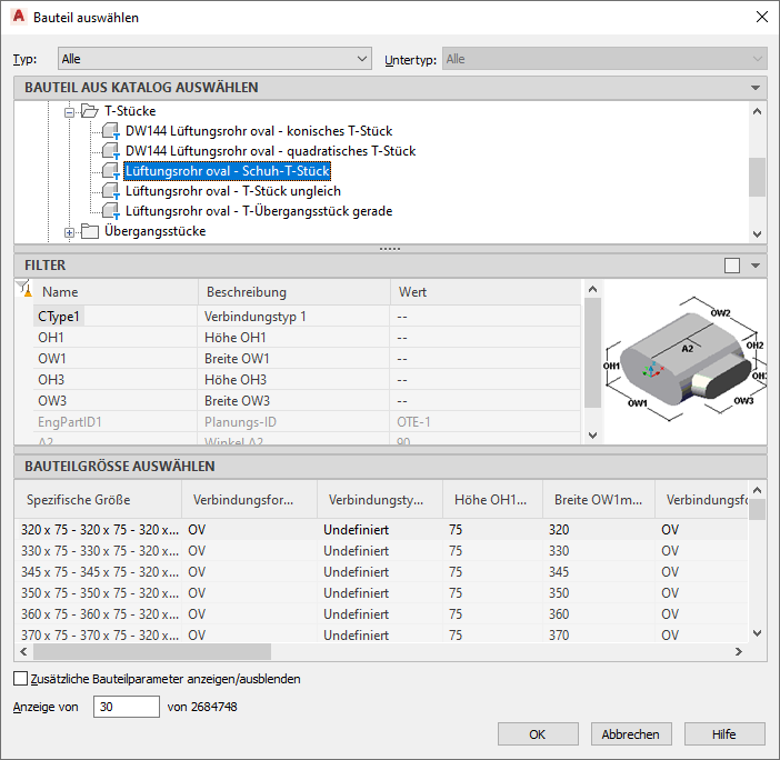 Unter Bauteil aus Katalog auswählen sind die Luftkanal/-rohr-Formstücke basierend auf dem Formtyp aufgeführt.