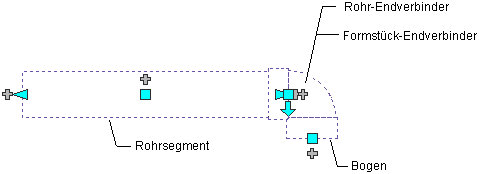 Mit Ausnahme von Kupplungen befinden sich die Rohrverbinder an den Enden der Rohrsegmente und Rohrformstücke. In der Zeichnung zeigt die Software ein Rohr, das mit einem Formstück am Ende des Formstücks verbunden ist. Bei einem realen Rohrsystem wird das Rohr jedoch in das Formstück eingesteckt.