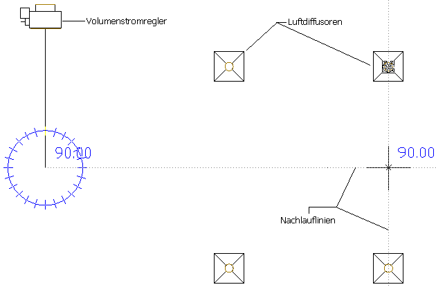 Draufsicht auf ein einfaches 1-Linien-System: Ein Volumenstromregler ist an vier Luftauslässen angeschlossen.