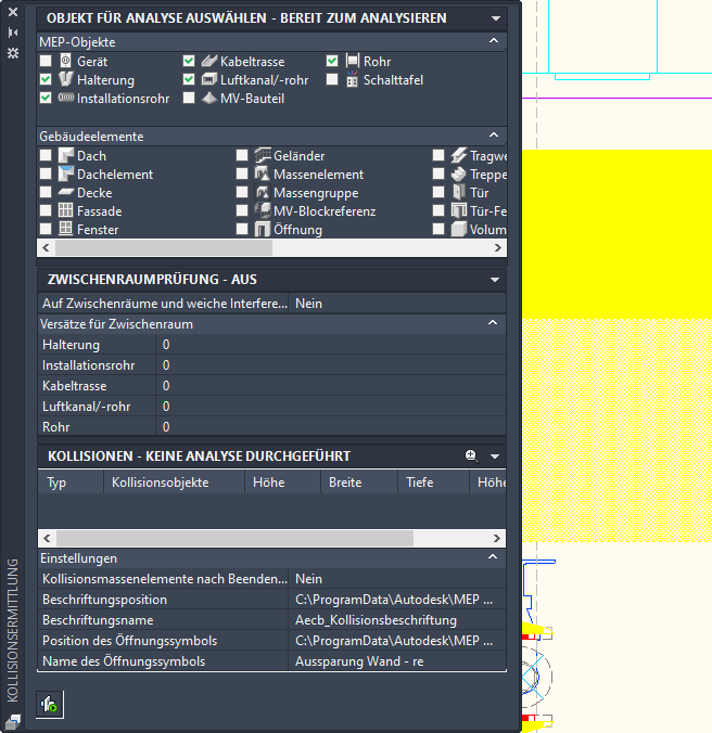 Anmerkung: Der Kollisionsanalysemodus wird pro Zeichnung jeweils durchgeführt. Wenn Sie zu einer anderen Zeichnung wechseln, wird die Palette für Kollisionsermittlung basierend auf der derzeit aktiven Zeichnung aktualisiert.