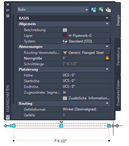 Die Länge eines Rohrsegments wird durch separate Verbindungen genau dargestellt. Die Schnittlänge auf der Eigenschaftenpalette ist die tatsächliche Länge des Rohrs und enthält Tiefen zum Einrasten der Flansche.