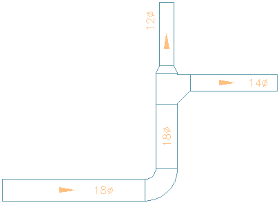 Die folgenden Beispiele zeigen Beschriftung, Fließrichtungspfeile, Bogen reduzierend und geraden Bogen und Reduzierstück in einer Luftkanal/-rohr-Strecke: