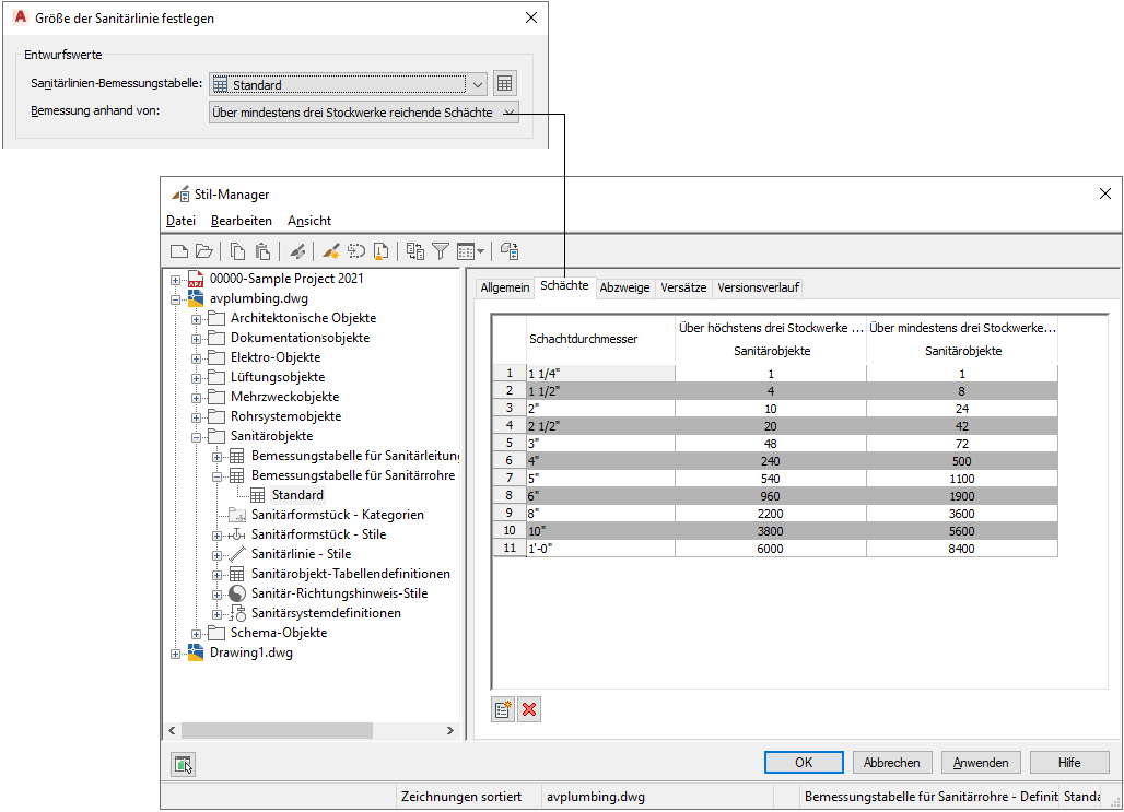 Wenn Sie die Sanitärstrecke als Stapel für höchstens drei Stockwerke definieren, führt das Sanitärmodul die Größenberechnungen anhand der Daten auf der Registerkarte Stapel der Sanitärlinien-Bemessungstabelle (Rohrbemessungstabelle) aus, deren Definitionen im Stil-Manager zu finden sind.