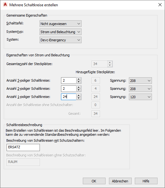 - Geben Sie im Dialogfeld Mehrere Schaltkreise erstellen unter Gemeinsame Eigenschaften Folgendes an: