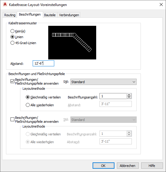 Sie können Beschriftungen oder Fließrichtungspfeile angeben, die während des Zeichnens zu Kabeltrassenstrecken hinzugefügt werden. Außerdem können Sie das anzuwendende Schraffurmuster angeben. Sie können vertikale oder diagonale Linien und den zu verwendenden Linienabstand angeben.