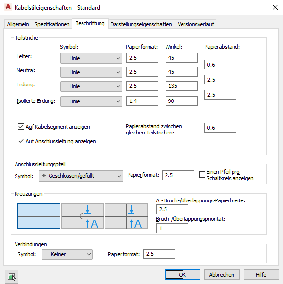 Sie können angeben, dass kreuzende Kabel unverändert, überlappend oder durch eine Unterbrechung einer bestimmten Breite dargestellt werden sollen.