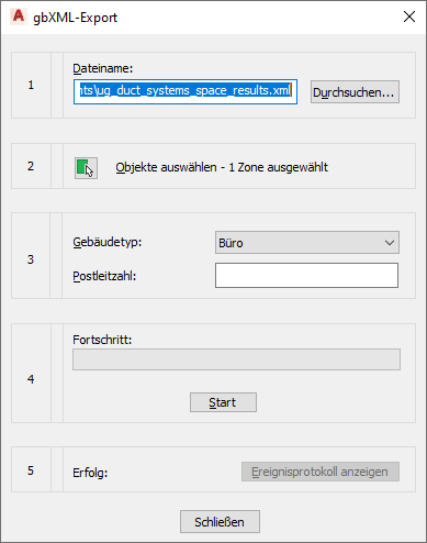 Nach dem Erstellen von Räumen und dem Gruppieren der Räume in Zonen können Sie wie im Folgenden beschrieben die Informationen in eine gbXML-Datei (Green Building XML) exportieren.