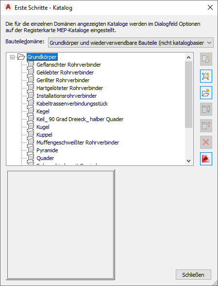 2. Wählen Sie im Dialogfeld Erste Schritte unter Bauteilkatalog die Option Grundkörper und wiederverwendbare Bauteile aus.