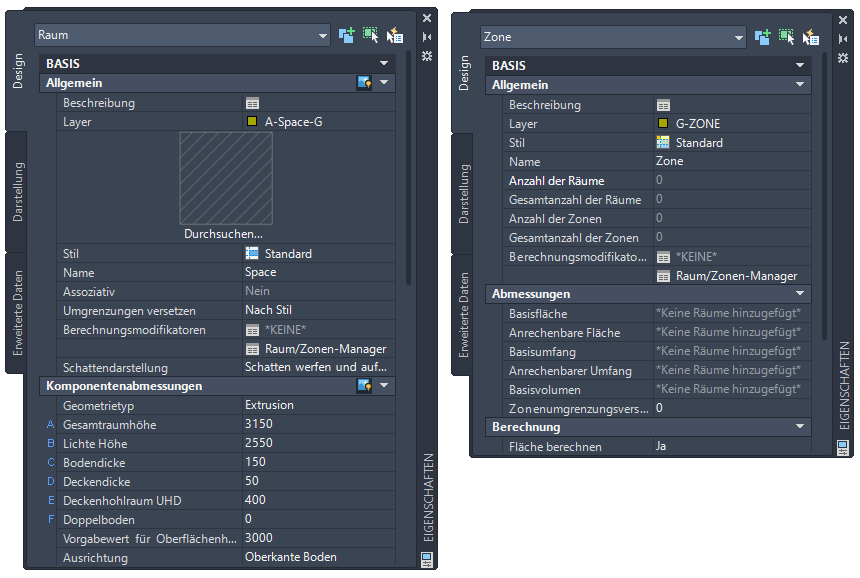 - Um die Berechnungen anzuzeigen, klicken Sie auf einen Raum oder eine Zone und wählen Sie in der Eigenschaftenpalette die Registerkarte Erweiterte Daten.