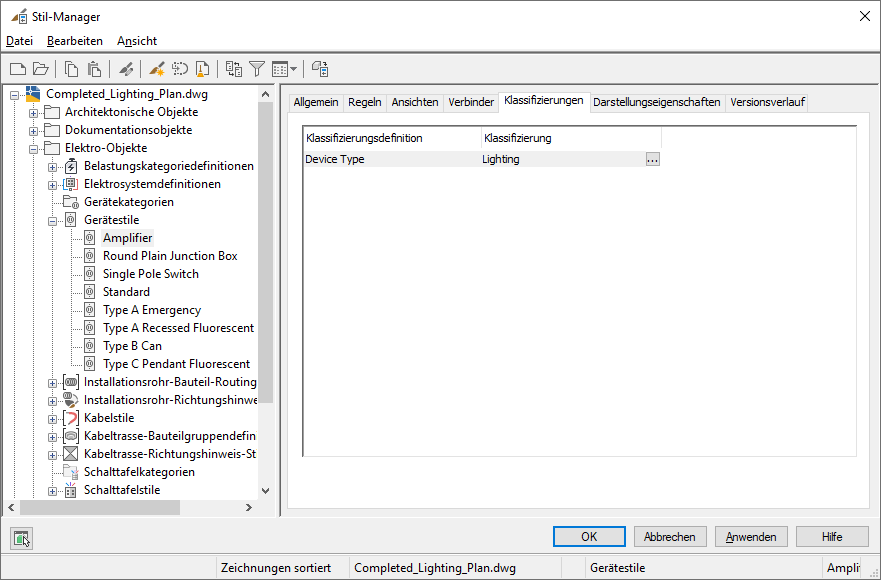 Sie können Darstellungssätze erstellen, die Objekte auf der Grundlage ihrer Klassifizierung ein- bzw. ausblenden, beispielsweise einen Darstellungssatz, der nur Geräte anzeigt, die als Beleuchtung klassifiziert sind. Viele mit der Software gelieferte Darstellungssätze werden auf diese Weise konfiguriert.