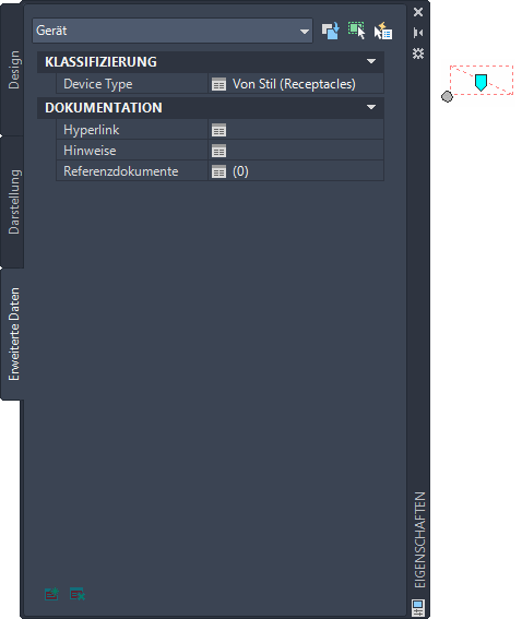Da Geräte in Zeichnungen Beispiele eines Gerätestils sind, hat ein Gerät für jede Klassifizierungsdefinition im Gerätestil eine Eigenschaft. Sie können auf der Registerkarte Erweiterte Daten der Eigenschaftenpalette die Klassifizierung für ein oder mehrere Geräte in der Zeichnung anzeigen oder überschreiben.