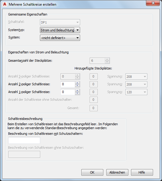 | Allgemein oder Weitere | Geben Sie unter Anzahl Schaltkreise die Anzahl der zu erstellenden Schaltkreise ein. |
