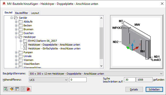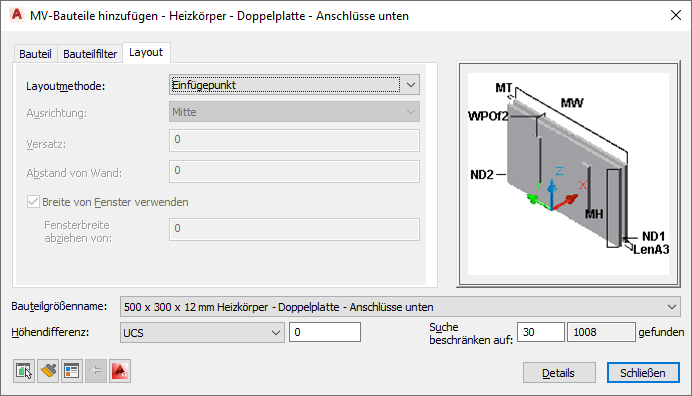 . Sie können einen Bauteilgrößennamen für den Heizkörper auswählen oder in der Software die geeignete Bauteilgröße auf der Registerkarte Layout berechnen (im Folgenden beschrieben).