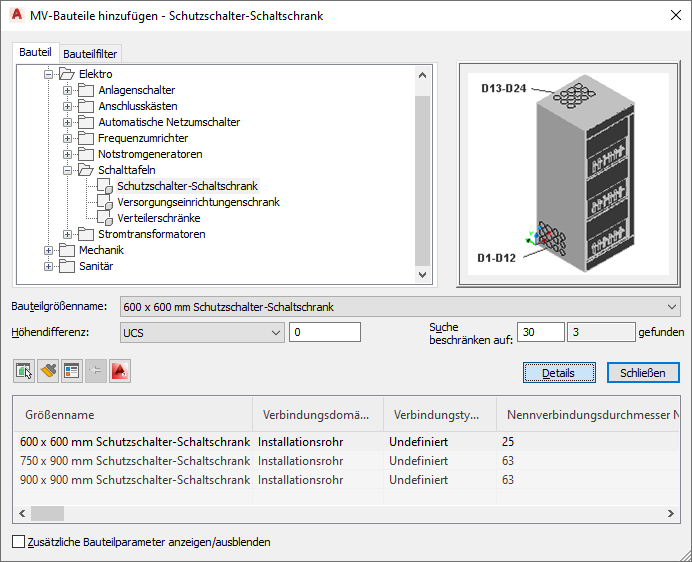 - Klicken Sie auf Details, um die verfügbaren Größen des gewählten Bauteiluntertyps anzuzeigen.