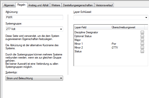 | Abkürzung | Identifiziert das System, dem Bauteile zugewiesen werden. Dabei handelt es sich um einen kurzen Systemnamen, der in der Regel zwei bis drei Zeichen lang ist. Die Abkürzung kann beim Beschriften von Objekten und Erstellen von Bauteillisten verwendet werden. |