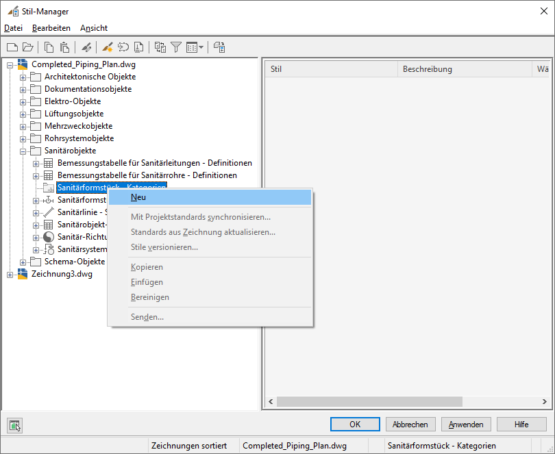 - Klicken Sie mit der rechten Maustaste auf die gewünschte Kategorie (in diesem Fall Sanitärformstück - Kategorien). Wählen Sie Neu.