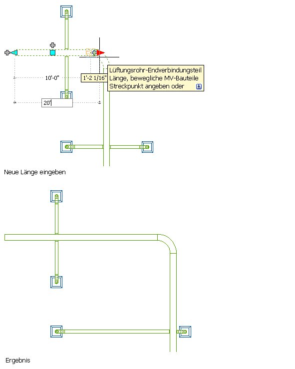 Folgendes Beispiel veranschaulicht, wie die Länge eines Luftkanal/-rohr-Segments geändert werden kann. Das horizontale Luftkanal/-rohr-Segment ist nach rechts gestreckt und in der Länge verdoppelt. Da die Änderung im Bearbeitungsmodus der beweglichen MV-Bauteile erfolgt, werden die verbundenen Objekte einschließlich der Bauteile angepasst, um ihre Verbindungen beizubehalten. Genauer gesagt werden das vertikale Luftkanal/-rohr-Segment und der Deckendurchlass, der dem rechtem Abzweig zugeordnet ist, verschoben.