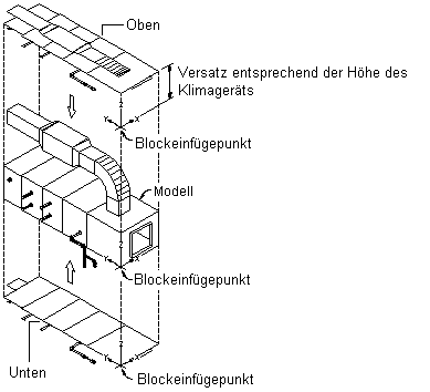 Die obigen Abbildungen zeigen den Einfügepunkt der Modellansicht als untere rechte Ecke der Vorderseite. Die Ansichten von oben und unten verwenden den rechten Eckpunkt der Vorderseite als Einfügepunkt, wobei der Einfügepunkt der Ansicht von oben um die Höhe des Lüftungsgeräts versetzt ist. Die Ansichten von vorne und hinten verwenden den rechten Eckpunkt der Unterseite als Einfügepunkt, wobei der Einfügepunkt der Ansicht von hinten um die Breite des Lüftungsgeräts versetzt ist. Die Ansichten von links und rechts verwenden den unteren vorderen Eckpunkt als Einfügepunkt, wobei der Einfügepunkt der Ansicht von links um die Länge des Klimageräts versetzt ist.