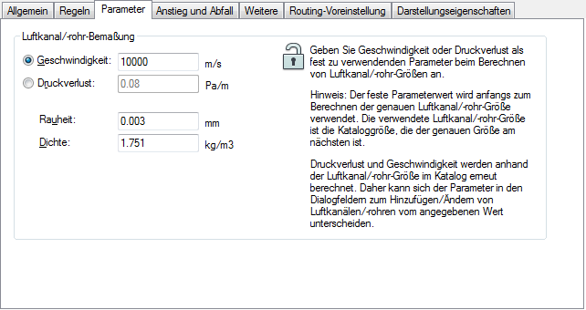Anmerkung: Im Dialogfeld Luftkanal/-rohr hinzufügen ist der festgelegte Parameterwert mit einem Sternchen (*) gekennzeichnet. Der festgelegte Parameterwert wird zu Beginn zur Berechnung der genauen Luftkanal/-rohr-Größe verwendet und dann benutzet, um eine verfügbare Größe im Katalog anzugeben. Nachdem Sie die Luftkanal/-rohr-Größe berechnet haben, kann der festgelegte Parameterwert im Dialogfeld zum Hinzufügen oder Ändern von dem unter Parameter angegebenen Wert abweichen. Weitere Informationen erhalten Sie unter "Methoden und Werkzeuge für die Luftkanal/-rohr-Bemaßung".