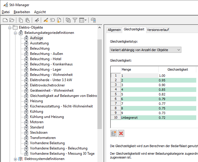 Jeder Gleichzeitigkeit ist ein Wert zugewiesen, der mit der Belastung multipliziert wird, um die Bedarfslast für eine Belastungskategorie festzustellen. Es ist wichtig, eine Bedarfslast festzulegen, um den Schaltkreis nicht zu überlasten. Wenn Sie einen Gleichzeitigkeitsfaktor definieren, erhalten Sie auch eine reale Berechnung der geschätzten Bedarfslast.