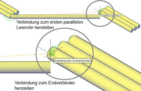 Beim Verbinden von zwei parallelen Installationsrohr- oder Rohrstrecken werden verschiedene Optionen für das Verbinden der zwei parallelen Strecken angezeigt, aus denen Sie wählen können.