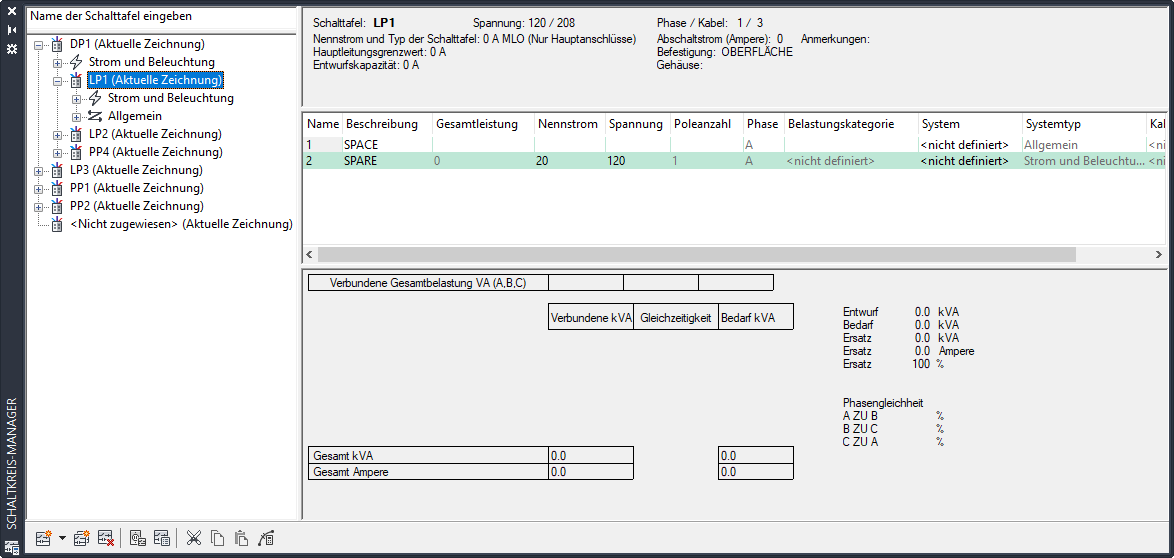 Bei Stromkreisen mit dem Systemtyp Strom und Beleuchtung kann die Belastung automatisch tabellarisch dargestellt werden. Wenn Sie einem Schaltkreis Geräte zuweisen, werden ihre Belastungen automatisch der Belastung des Schaltkreises hinzugefügt. Sie können im Schaltkreis-Manager Schaltkreisbelastungen anzeigen oder Schaltkreisinformationen oder einen Schaltkreisbericht für ein oder mehrere ausgewählte Geräte aufrufen.