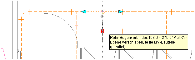 Beachten Sie, dass die mit der Sanitärlinie verbundenen Bogen mit verschoben werden und sich die Länge der an die Bogen angeschlossenen Sanitärlinien ändert. Das System bleibt verbunden.