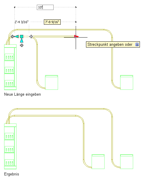 | Angeben der neuen Gesamtlänge | Drücken Sie TAB, um das Eingabefeld zu aktivieren, in das Sie dann die Bemaßung und die neue Länge eingeben können. Drücken Sie EINGABE. |