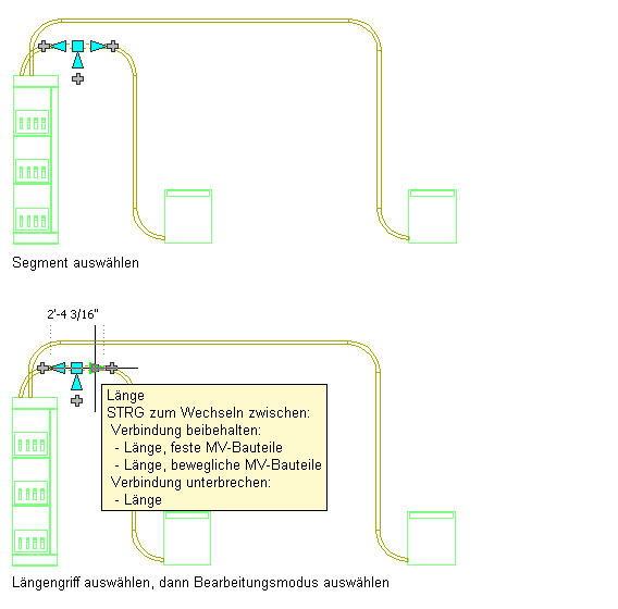 Wenn Sie den Längengriff an einem Ende verwenden, das mit einem anderen Objekt verbunden ist, müssen Sie angeben, ob Sie möchten, dass AutoCAD MEP 2027-Toolset beim Ändern der Länge die Verbindung zwischen den Objekten beibehält.