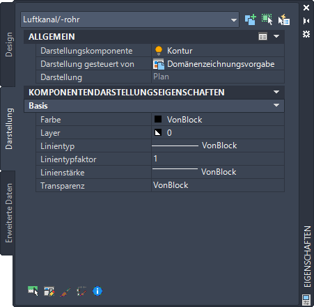 Registerkarte Darstellung mit den Darstellungseigenschaften für Luftkanal/-rohr
