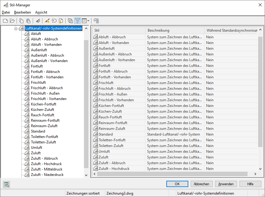 Systeme werden über AutoCAD MEP 2027-Toolset-Vorlagen geladen. Wenn Sie keine AutoCAD MEP 2027-Toolset-Vorlage verwenden, können Sie über den Stil-Manager Systemdefinitionen aus anderen Zeichnungen importieren. Weitere Systemdefinitionen sind in der Datei System Definitions.dwg zu finden, die sich in einem Unterordner des folgenden Verzeichnisses befindet: \ProgramData\Autodesk\MEP <version>\deu\Styles.