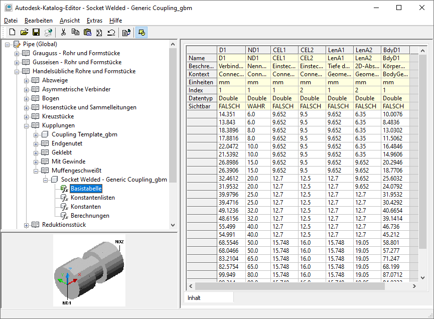 Jedes Rohrverzeichnis im Profil Global besteht aus den für diesen Rohrtyp üblichen Formstücken. Rohrformstücke werden in der Regel nach Bauteiltyp, Verbindungstyp und Nenndruck klassifiziert. Das folgende Beispiel zeigt die Verzeichnisstruktur für eine muffengeschweißte Kupplung der Klasse 3000.