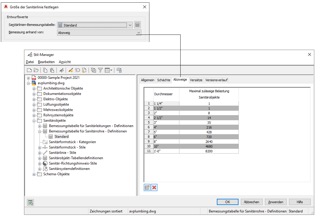Wenn Sie die Sanitärstrecke als Abzweig definieren, führt die Software die Bemessungsberechnungen anhand der Daten auf der Registerkarte Abzweige in der Sanitärlinien-Bemessungstabelle (Rohrbemessungstabelle) aus, deren Definitionen im Stil-Manager zu finden sind.