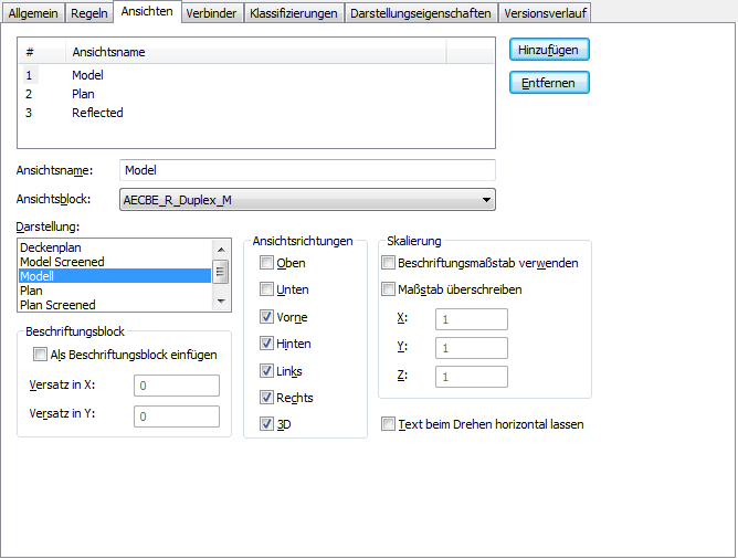 Die Ansichtseigenschaften im Geräteumwandlungs-Skript befinden sich auf der Registerkarte Ansichten des Stil-Managers. Die Eigenschaft Beschriftungsansicht heißt auf der Registerkarte Beschriftungsblock.