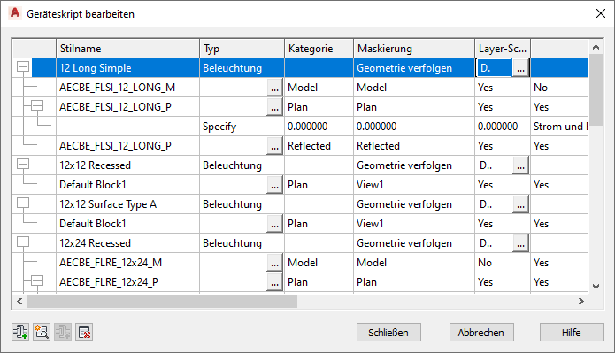 Die Eigenschaft Category (Kategorie) im Skript wird im Stil-Manager nicht angezeigt. Gerätekategorien dienen zum Gruppieren der Geräte (Gerätestile) im Arbeitsblatt Gerät auswählen. Dies erleichtert das Durchsuchen der verfügbaren Geräte. Gerätekategorien werden direkt im Arbeitsblatt erstellt und verwaltet. Weitere Informationen finden Sie unter "Erstellen von Kategorien in AutoCAD MEP 2027-Toolset".