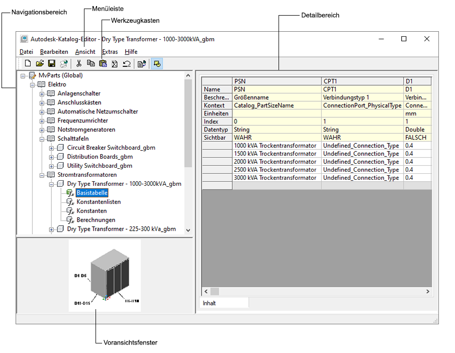 Im Vorschaubereich links unten im Katalog-Editor wird das Teil als gerendertes dreidimensionales Bild (3D) dargestellt. Parameter, die das Bauteil definieren, werden als Bemaßung bezeichnet.